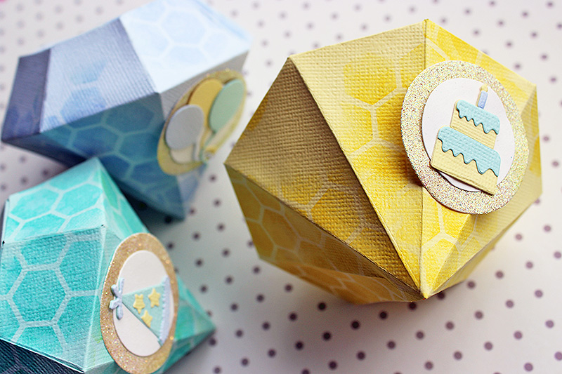 Step 4. Fill the diamonds with candies and gently adhere the cover shut as well. Die cut the embellishments for the boxes using "Birthday" set from Sidekick series and circles in two sizes using "Circles" Framelits dies. Use the same color scheme as in the boxes. You can also use the "left overs" from the first cut as the "Birthday" dies are so small. Waste none!