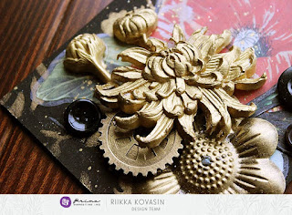 Materials: 655350640576 reDesign Décor Transfer Floral collection , 655350635756 reDesign Décor mould Leafy Blossoms mould , 655350643072 reDesign Décor mould Botanist Floral mould , 655350642136 Modelling material , 655350638344 reDesign Stick and Style stencil roll Cornelle Garden , 963958 Art Alchemy Metallique Vintage Gold , 963057 Art Alchemy acrylic paint Metallique Ancient Coin , 961367 Art Basics 3D Gloss Gel , 960322 Mechanicals Mini Flowers , 963323 Art Ingredients Melange Art Pebbles , 994563 Memory Hardware self adhesive chipboard tags , 961442 Art Basics Heavy Gesso White , 961459 Art Basics Heavy Gesso Black , 599447 Altered Card Set White , 599430 Altered Card Set Black ,